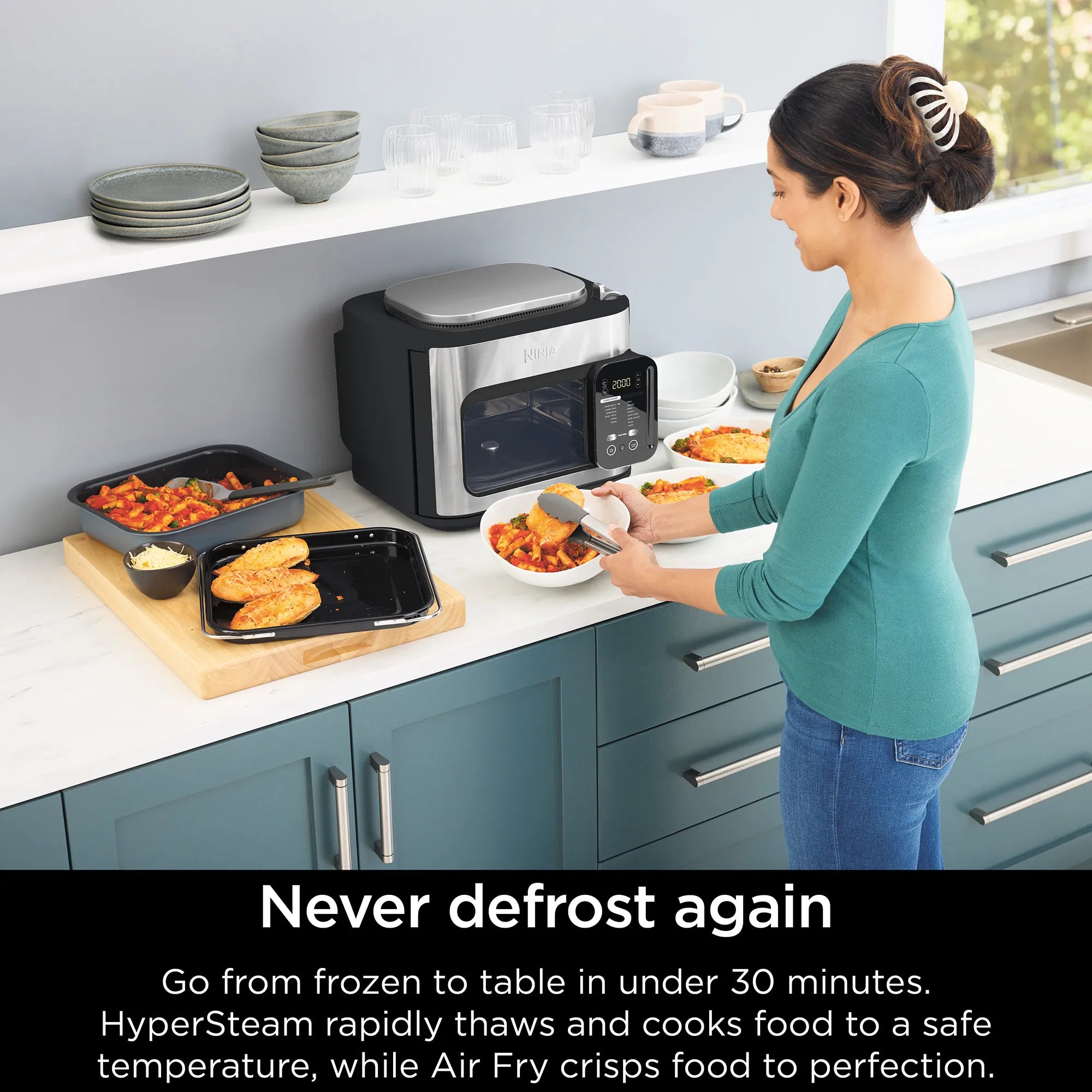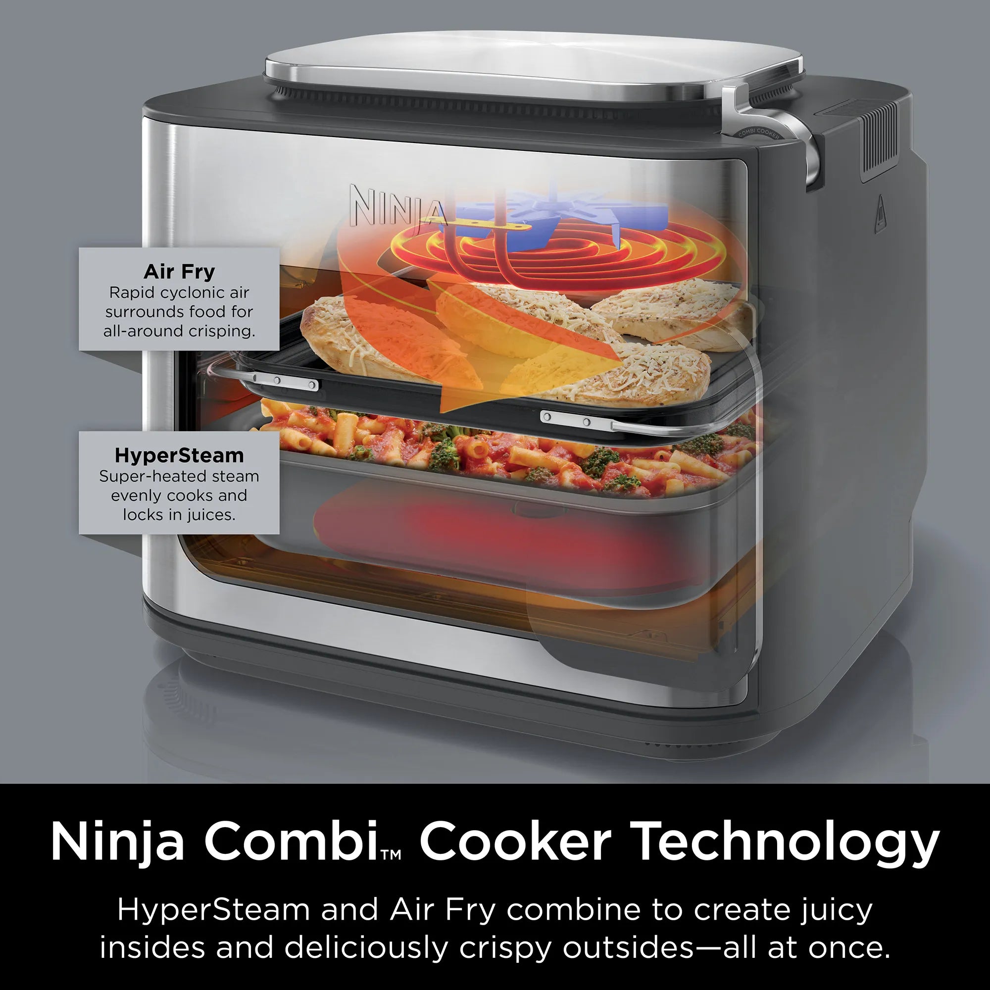 Meet the Ninja Combi™ — the only all-in-one multicooker, oven, air fryer and so much more that perfectly cooks complete meals for your whole family in just 15 minutes. With 14 functions and 3 included accessories, it’s so easy to use you will never have to turn on your kitchen again. A complete pasta dinner made from scratch in an oven without having to boil water? A full taco spread, including rice and beans in one single appliance? The Ninja Combi™ makes it all possible with our revolutionary Ninja Combi™ Cooker Technology that defies limits with a simultaneous combination of HyperSteam and Air Fry. Every ingredient is perfectly cooked in minutes — juicy on the inside, crispy on the outside. It’s the most effortless way to cook—the Combi Way™.
