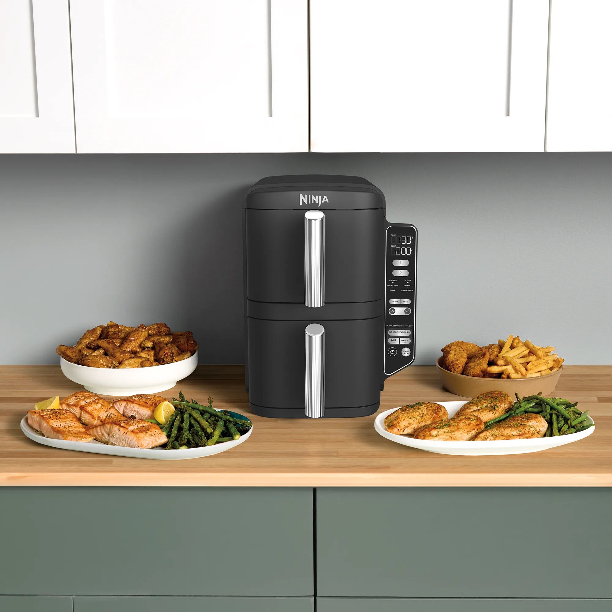 Meet the Ninja® DoubleStack™ XXL 2 Drawer Air Fryer, the only stacked 2 drawer air fryer that can cook up to 4 foods at once. Designed for efficiency, versatility and easier family sized meals, Ninja’s stacked 7.6L design maximises benchtop space while giving you the power and capacity of 2 air fryers in the footprint of one. Only Ninja has DoubleStack Air Frying technology that delivers the optimal air flow and even heat required to cook 4 foods at once for crispy, golden perfection every time. Simply load your veggies onto the crisper plate, insert the stacked meal rack into the drawer, and place your proteins on top to cook 2 different foods in one drawer. Two 3.8L drawers allow you to simultaneously prepare different dishes, making multitasking in the kitchen a breeze. Cook more food in a smaller footprint — easily fits 900g of wings in each drawer. Perfect for smaller kitchens, enjoy delicious homemade meals while keeping your benchtop clear of clutter.