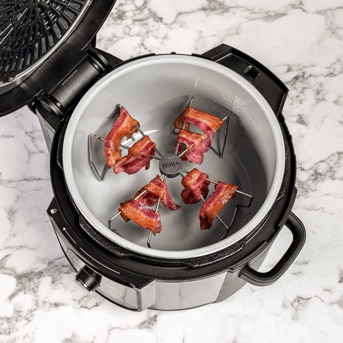Cook an entire pack of bacon to crispy perfection. Skip the splatter and frustrating clean up. The vertical cooking means all the excess grease drains away. Also excellent for crisping tortillas.